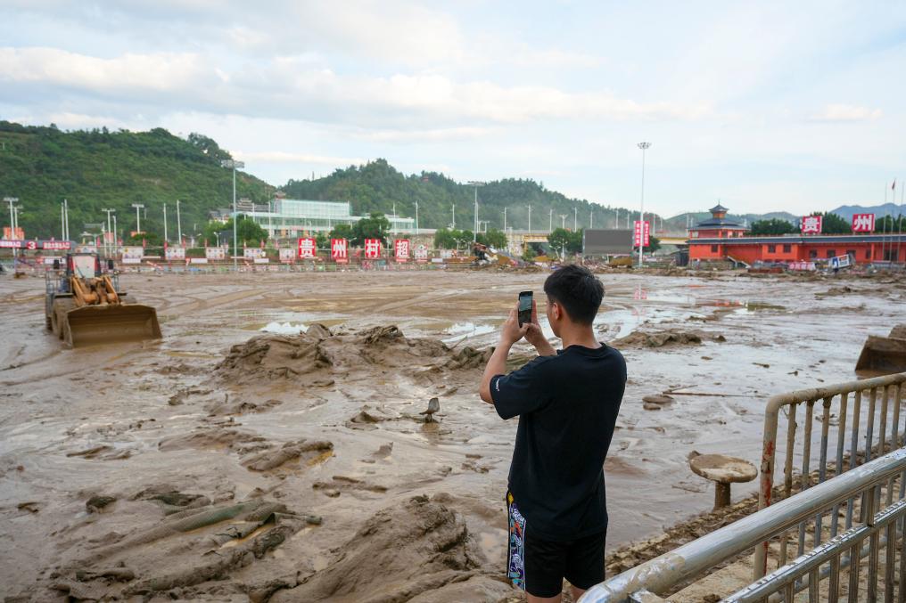 6月25日,林进标在贵州省榕江县“村超”球场拍摄洪水退后的场景。新华社发(龙建睿摄)