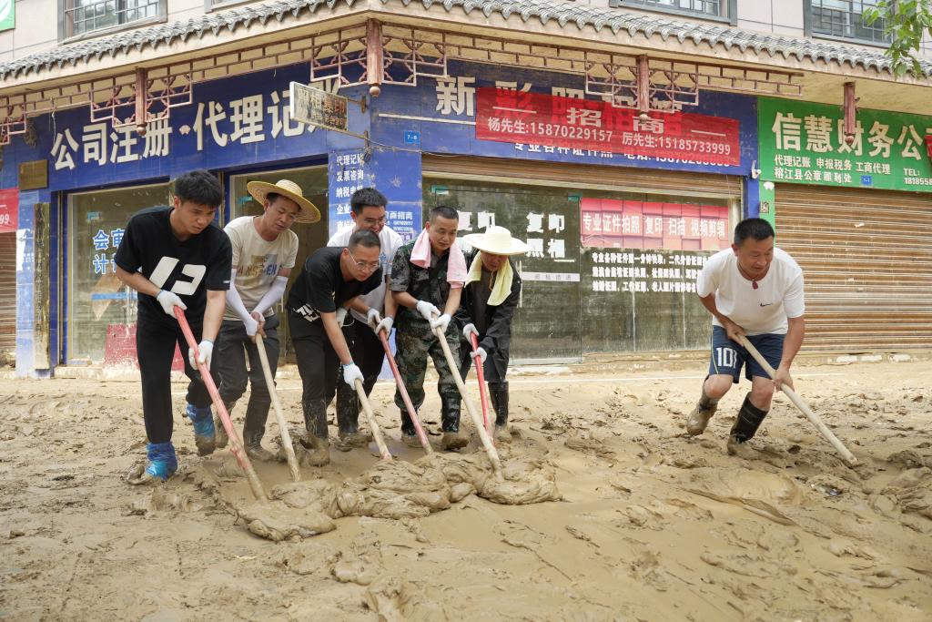 6月26日,林进标(左一)在贵州省榕江县新城区清淤。新华社发(王炳真摄)