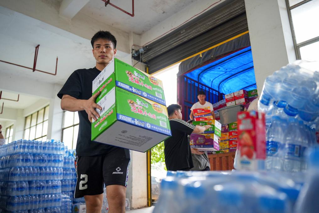 6月25日,林进标在贵州省榕江县工业园区搬运救援物资。新华社发(龙建睿摄)
