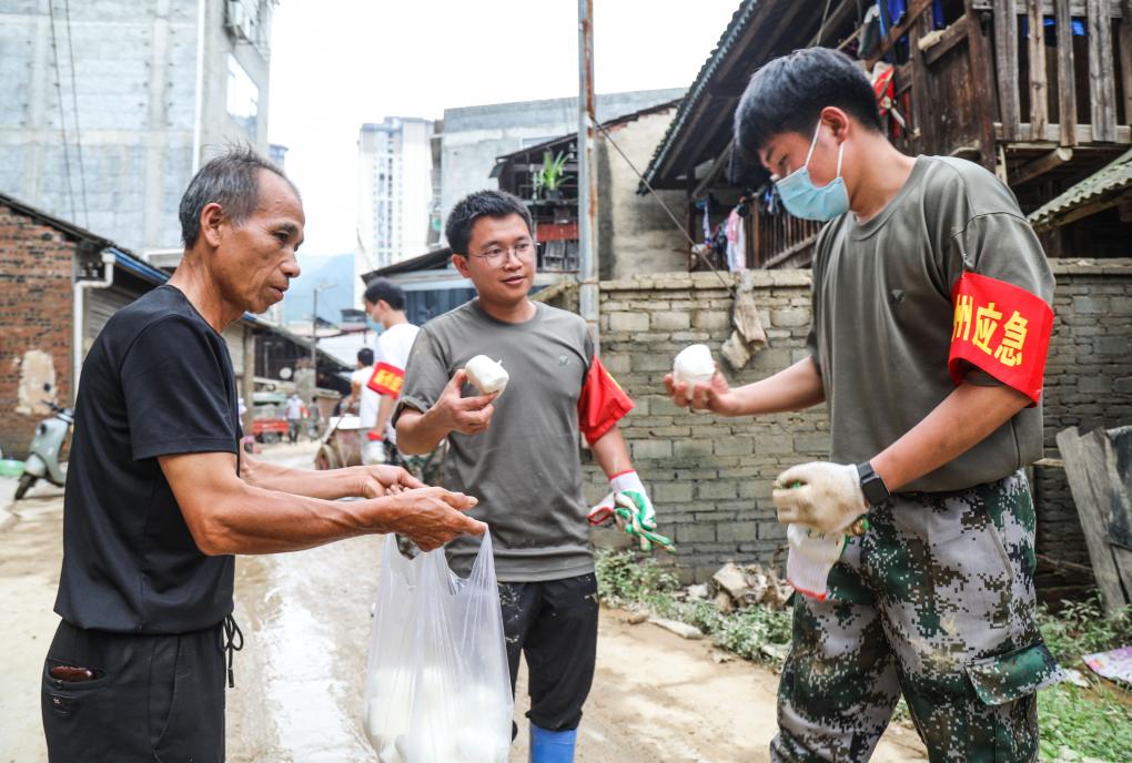 6月27日,在贵州省榕江县城,村民(左)将蒸好的馒头送到救援人员手中。新华社发(余天英摄)