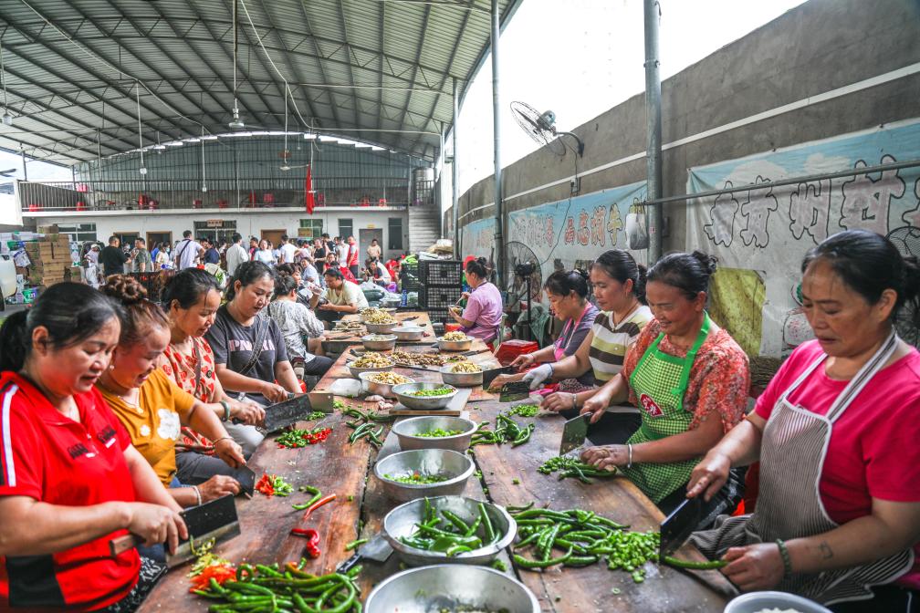6月27日,村民在贵州省榕江县忠诚镇一处后勤伙食保障点切菜。新华社发(余天英摄)