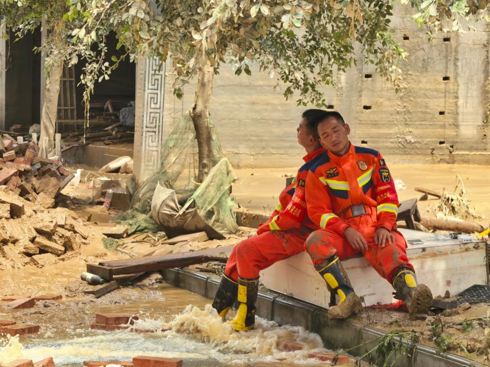 6月26日,榕江县消防队员、党员张齐武(右)在救援后疲惫地靠在战友身上休息。 新华社发