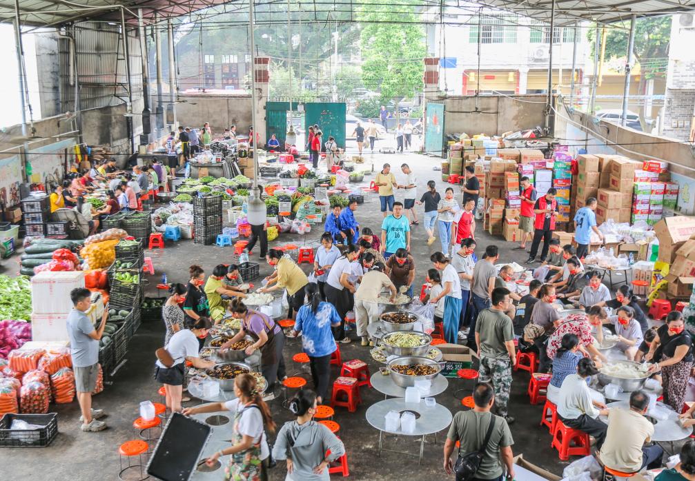 我们追随着喇叭声来到做饭地点——由镇政府临时设置的大食堂,食堂内挤满了人,正升腾着滚滚热气。几十名村民系着围裙忙碌着,菜刀剁在案板上的“咚咚”声此起彼伏。摘菜、洗菜、切肉、炒菜、打包,一片繁忙景象。