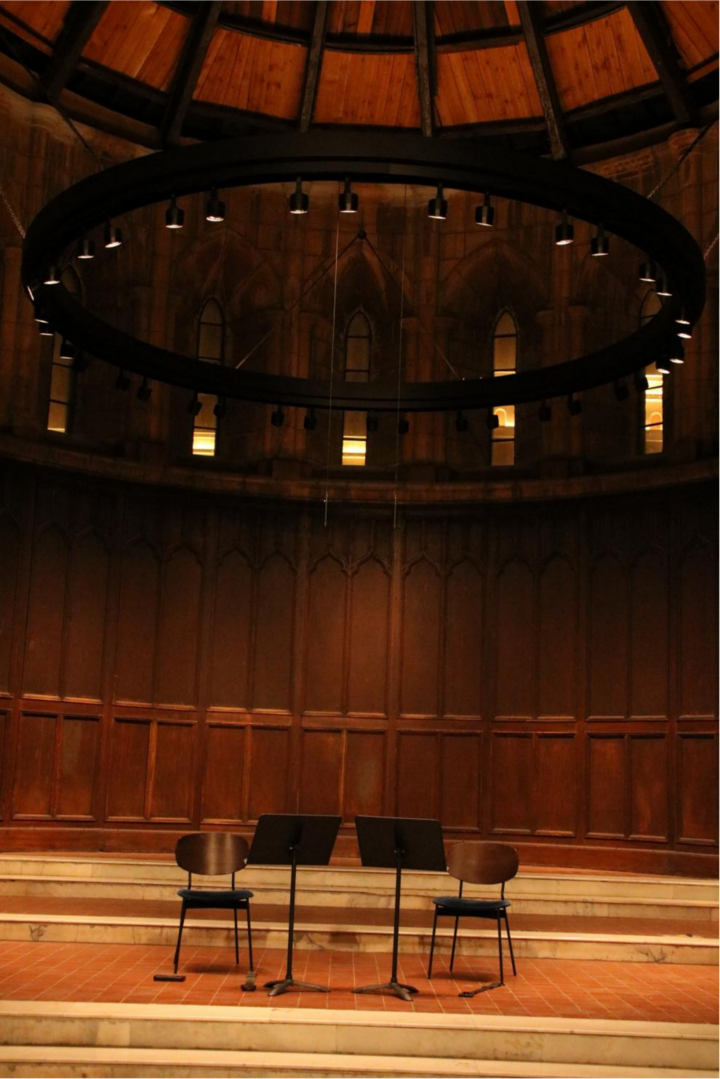 第二天晚上,我又来到安里甘艺术中心,观看天津音乐学院师生演奏的“仲夏弦音:大提琴的沉吟与重奏”音乐会。坐在安里甘主堂倒沙漏形的穹顶下,沐浴在大提琴深情庄严的奏鸣中,我沉醉了。
