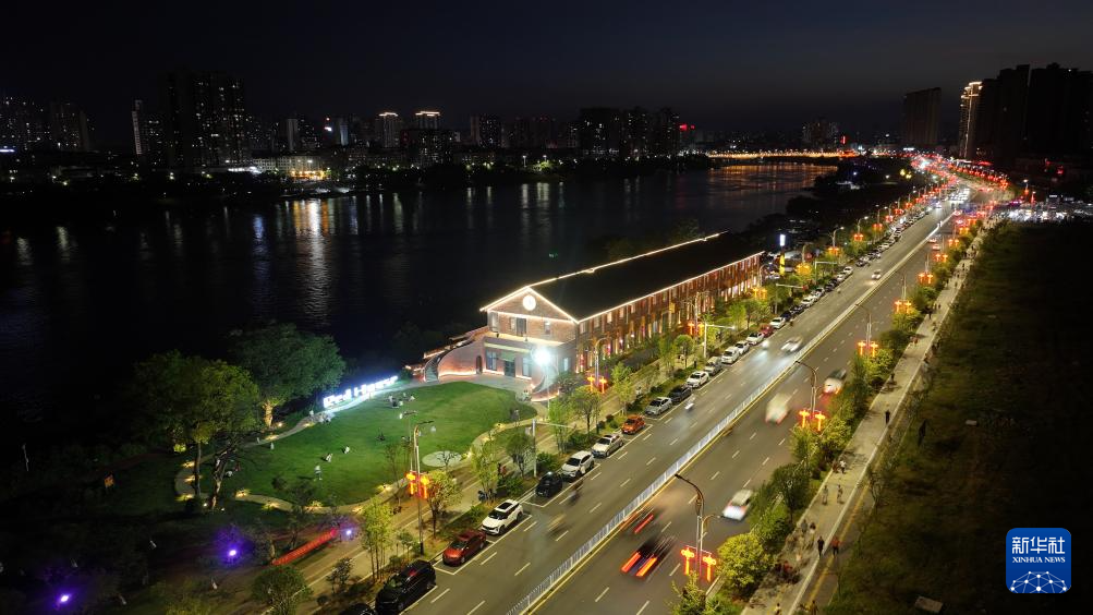 这是2025年7月15日拍摄的冷水滩区湘江西路夜景(无人机照片)。 新华社发(蒋静 摄)