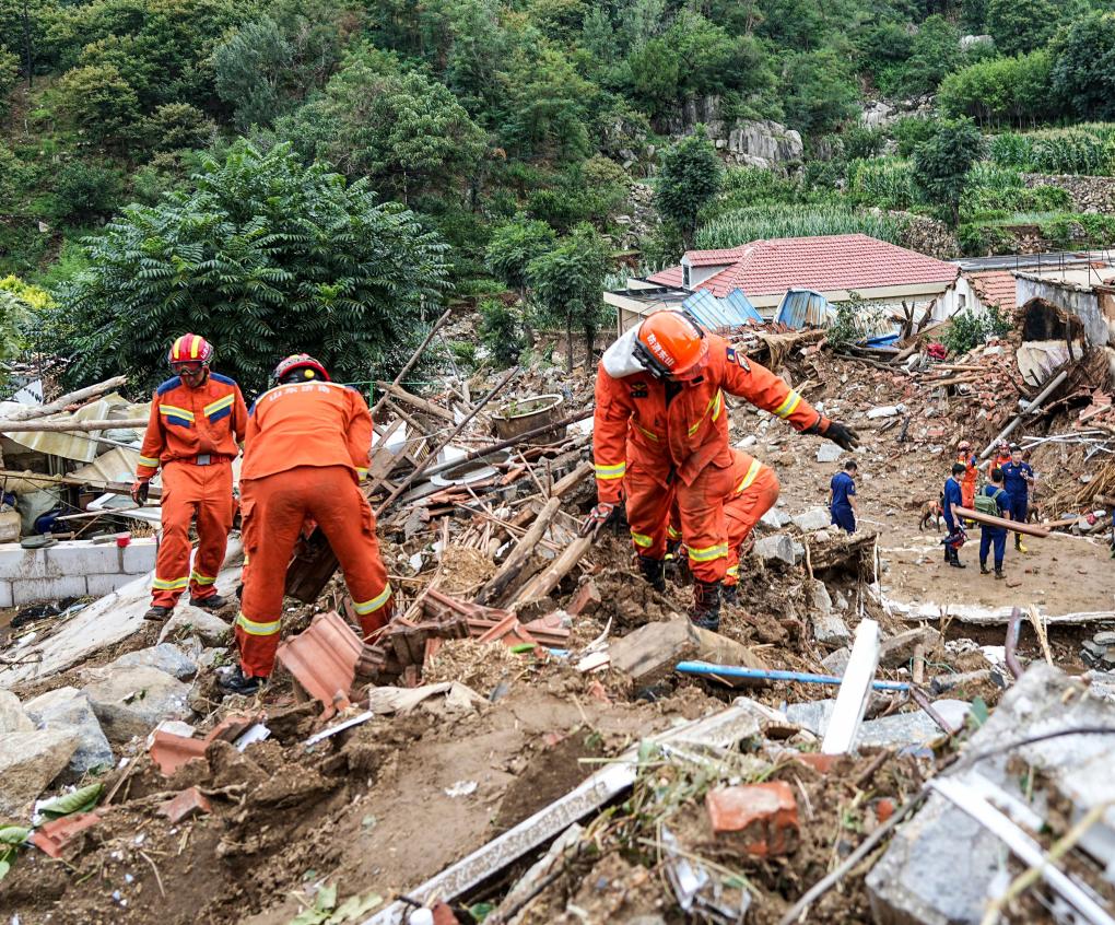 7月22日,救援人员在济南市莱芜区大王庄镇石屋子村开展搜救。新华社记者 朱峥 摄