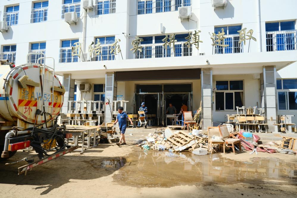 7月31日清晨,课桌上的泥土正在操场上被冲刷干净,食堂地面厚厚的淤泥也被彻底清理。刚刚经历过一场洪水的天津市蓟州区下营中学,正在一点点恢复生机。
