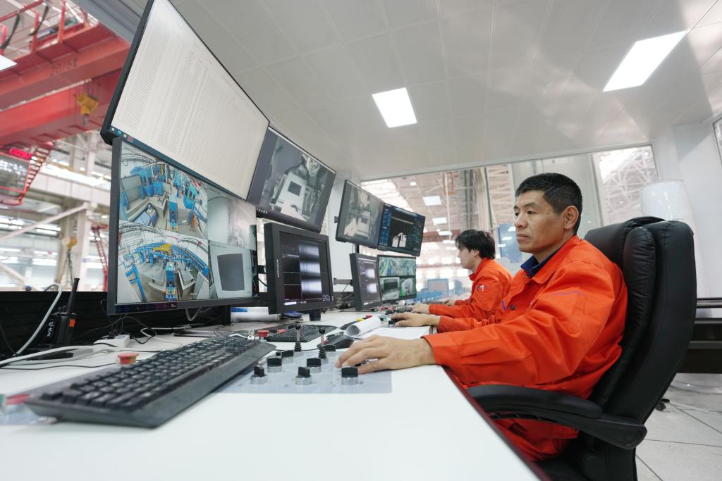 在哈尔滨电机厂有限责任公司线圈分厂智能制造车间,技术人员操作智能数控设备进行生产作业(7月24日摄)。