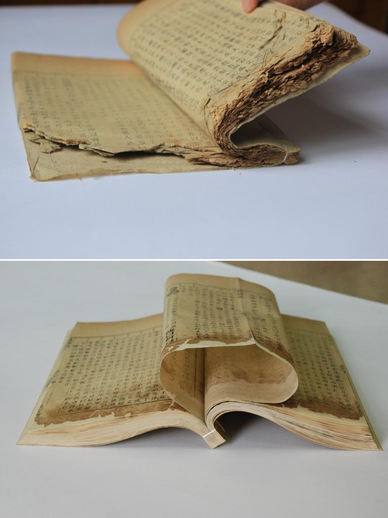 这是古籍修复前后的对比图(上图为修复前的古籍,下图为修复后的古籍)。