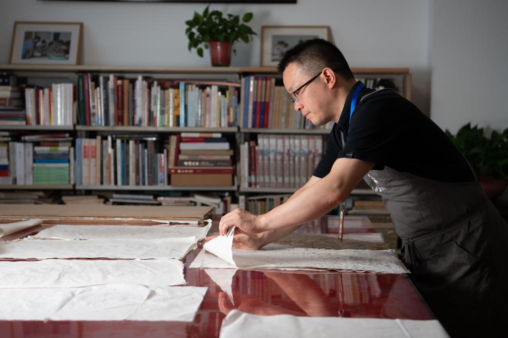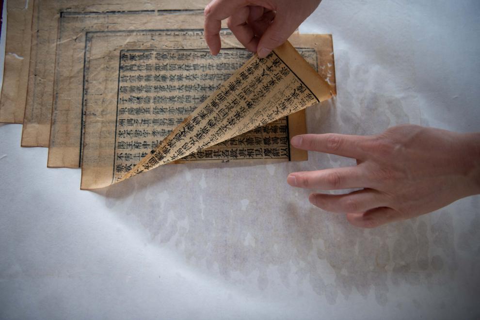 6月24日,在安徽省图书馆内,古籍修复师臧春华在揭开清洗后的书叶。