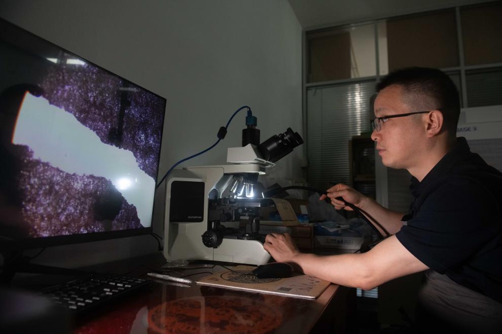 6月4日,在安徽省图书馆内,古籍修复师臧春华在使用专业仪器查看纸张纤维。
