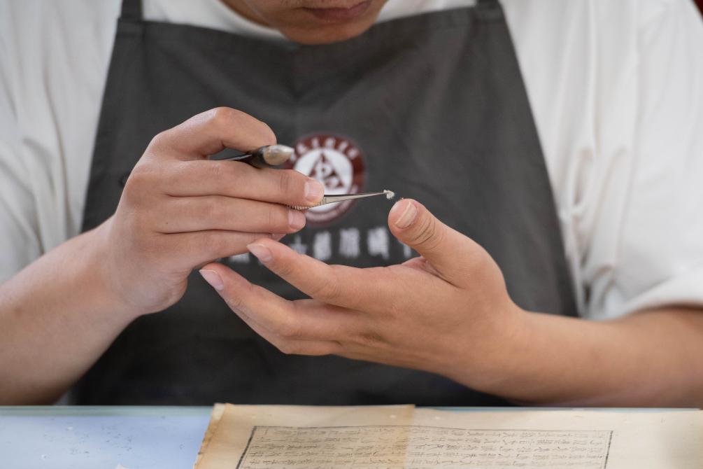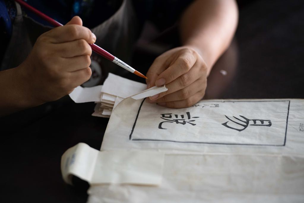 6月24日,在安徽省图书馆内,古籍修复师金鑫在拼碎片。
