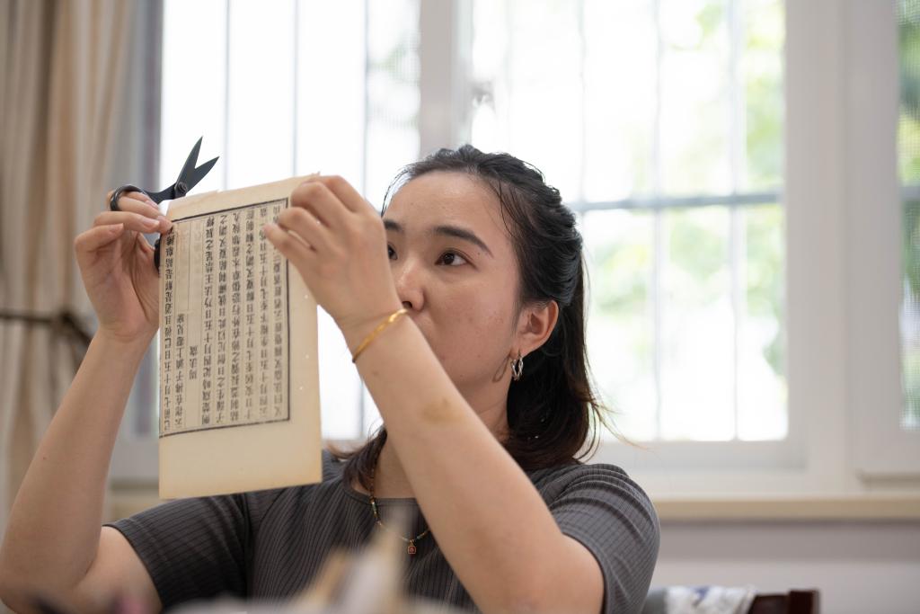 6月4日,在安徽省图书馆内,古籍修复师耿宁在修剪书叶。