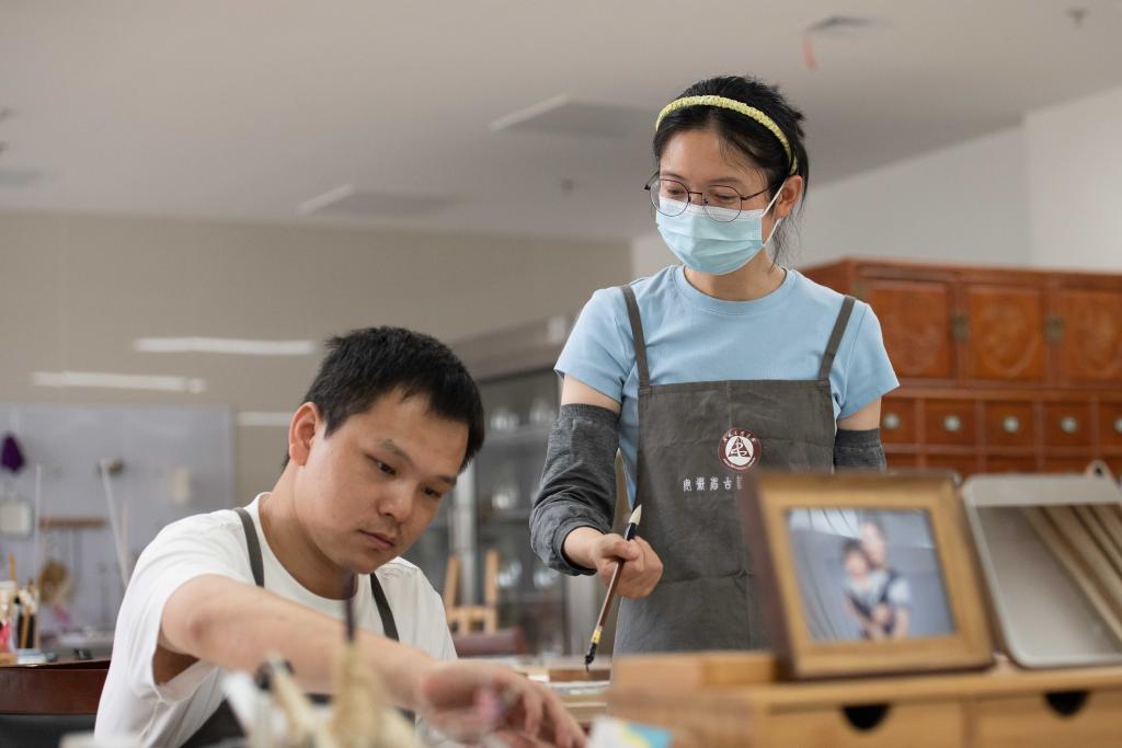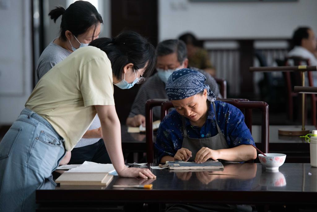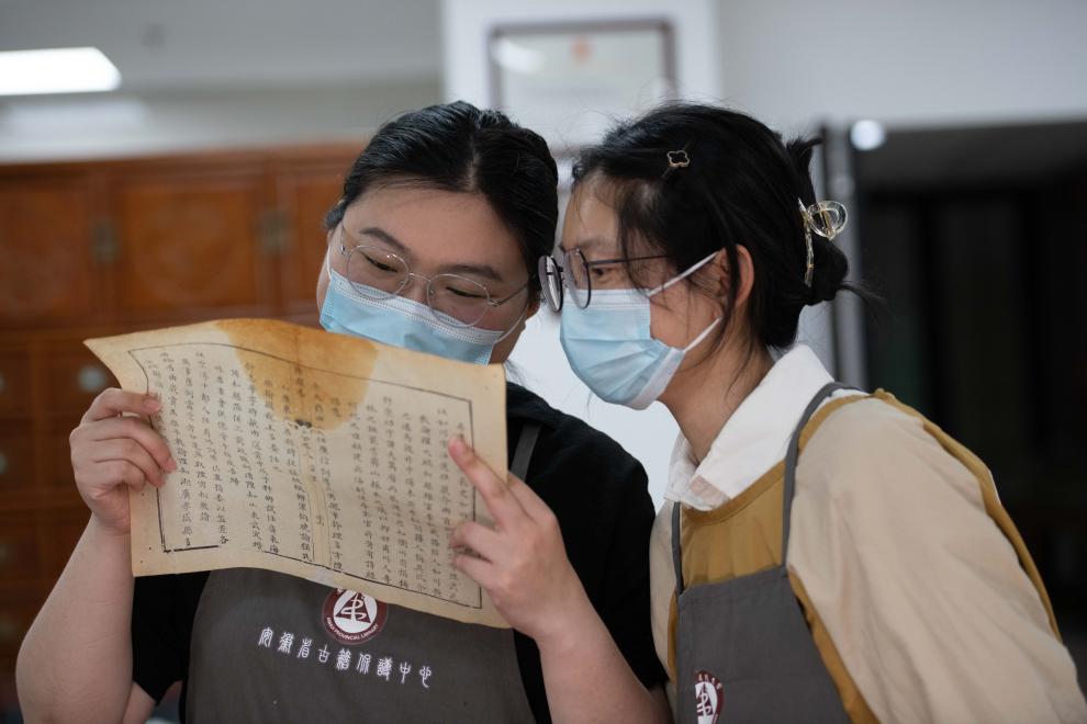 6月17日,在安徽省图书馆内,古籍修复师张文文(右)与同事金鑫在古籍修复过程中交流。