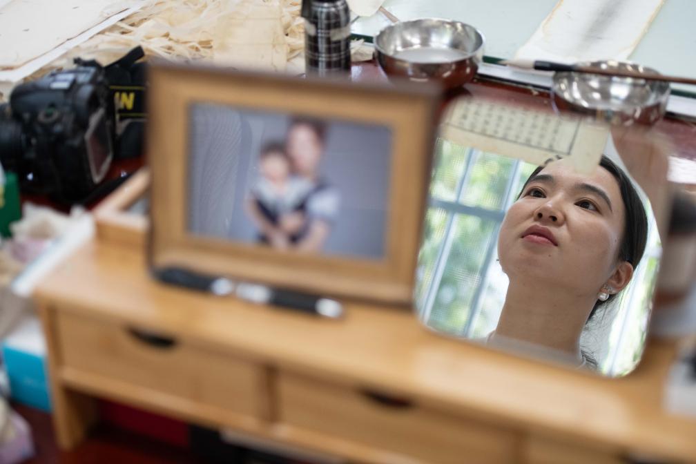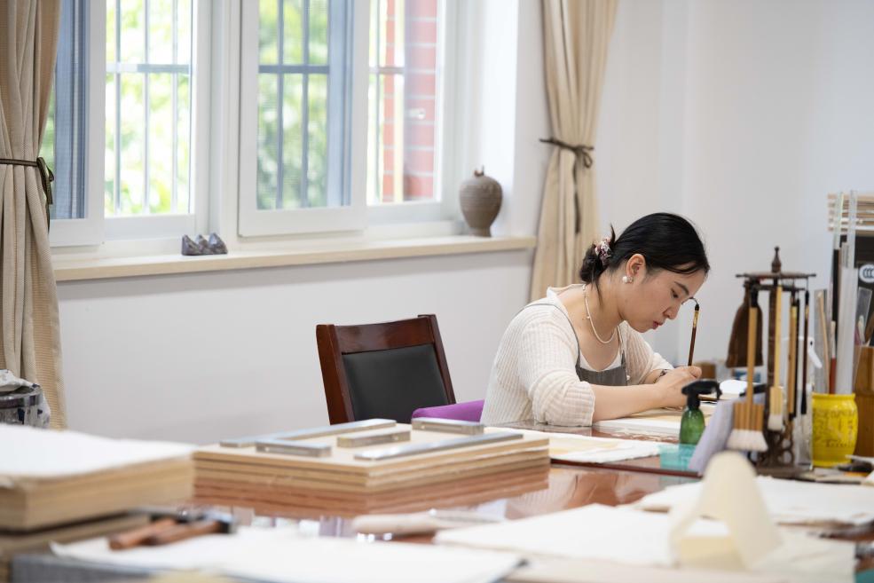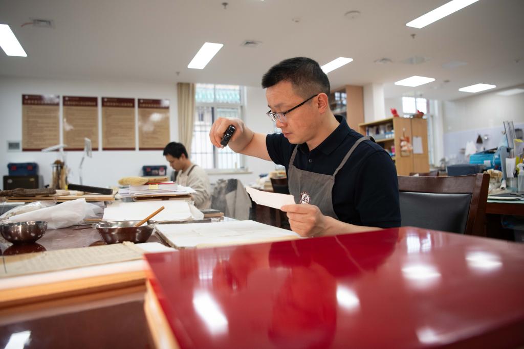 6月17日,在安徽省图书馆内,古籍修复师耿宁在修补书叶。