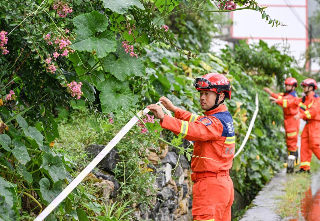 8月12日,抢险救灾人员在重庆市彭水县太原镇区阳村一地灾风险点拉起警戒线。新华社记者 王全超 摄