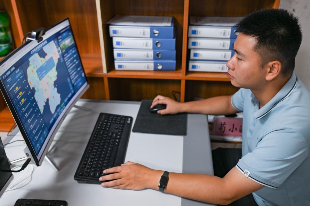 8月11日,重庆市合川区小沔镇工作人员使用基层智治平台进行防汛防地灾工作调度。新华社记者 王全超 摄