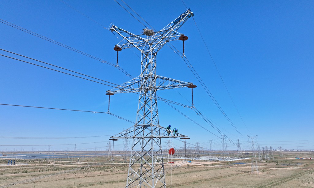 国网东营供电公司工作人员为输电线路安装绝缘防鸟罩。新华社发