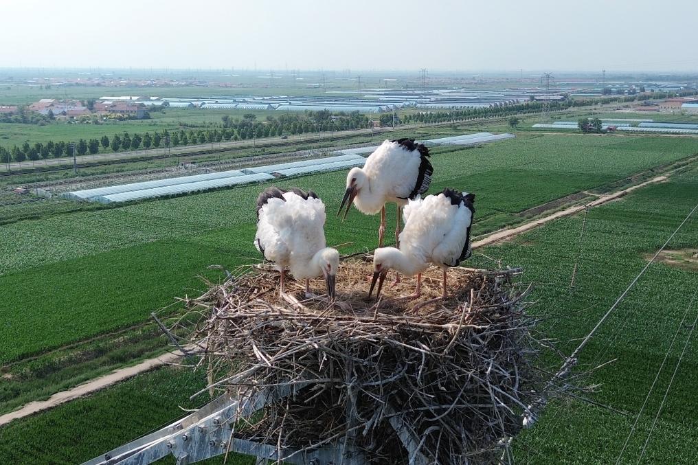 新华社济南8月15日电(记者贾云鹏)走进位于山东东营的黄河三角洲湿地,芦苇荡翻涌着翠浪,成群的飞鸟舒展羽翼掠过滩涂。在220千伏新孤-海口输电线路的一处铁塔上,两只东方白鹳幼鸟正在鸟窝里休憩。