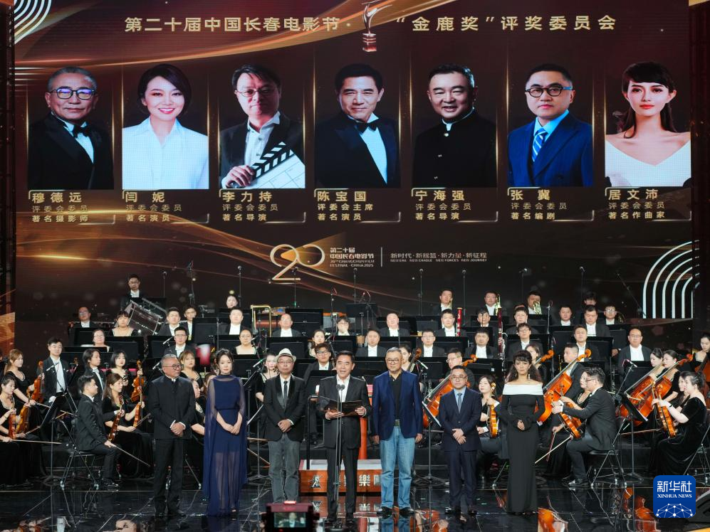 8月23日,本届长春电影节“金鹿奖”评委会亮相第二十届中国长春电影节开幕式暨长影成立80周年交响音乐会现场。新华社记者 张楠 摄