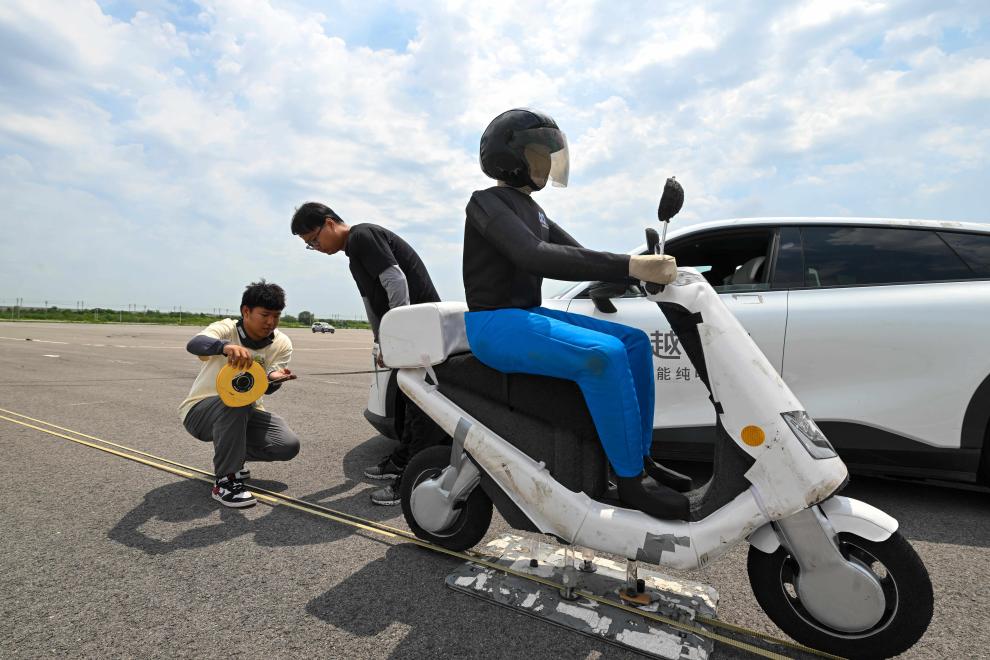 天津(西青)国家级车联网先导区封闭测试场内,测试人员正在对安全测试结果进行测量。新华社记者孙凡越 摄