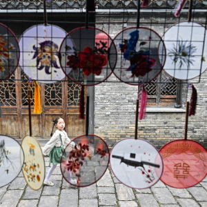 10月1日,小朋友走在盱眙县第一山历史文化街区。新华社记者 季春鹏 摄