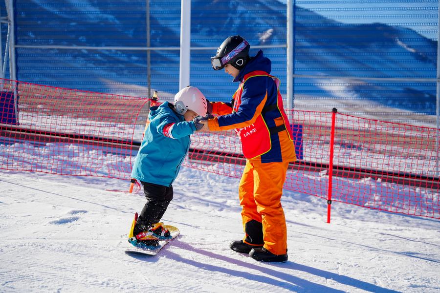教练在赛里木湖滑雪场教小朋友滑雪(2025年11月29日摄)。新华社记者 徐宏岩 摄