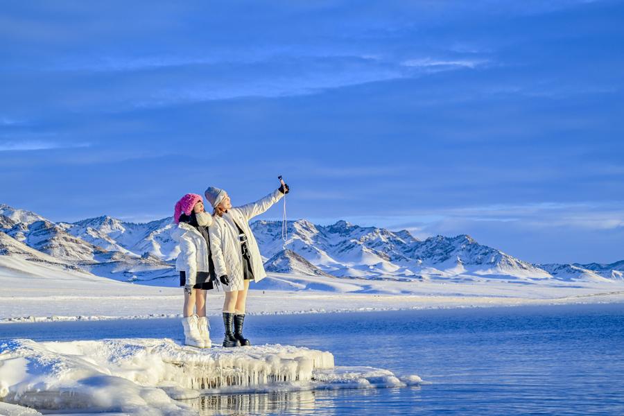 游客在赛里木湖边打卡拍照(2024年12月23日摄)。新华社记者 陈朔 摄
