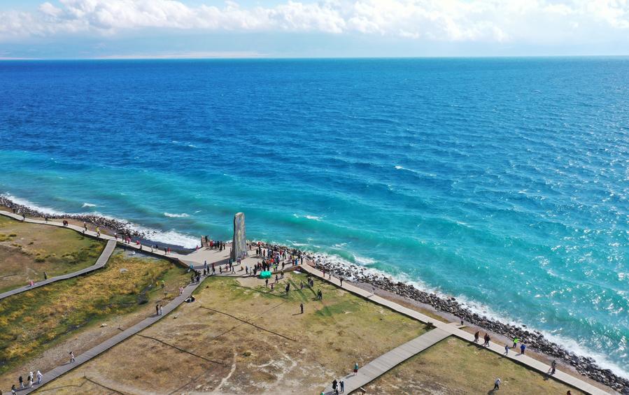 游客在赛里木湖景区游览(2025年9月12日摄,无人机照片)。新华社记者 李贺 摄