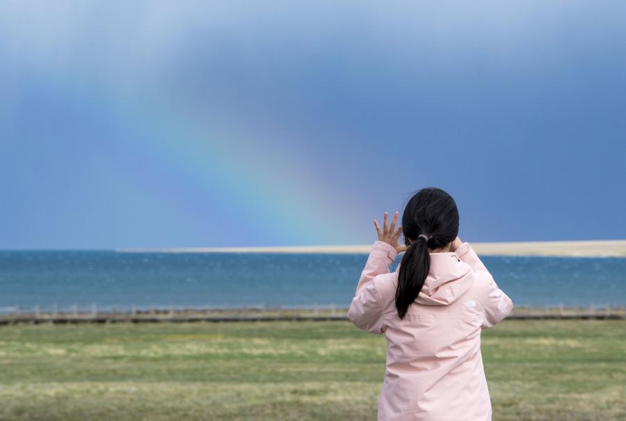 一位游客在赛里木湖边拍摄彩虹(2023年5月21日摄)。新华社记者 王菲 摄