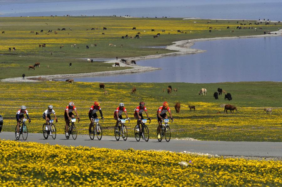 环赛里木湖公路自行车赛的参赛选手在鲜花盛开的赛里木湖畔穿越前行(2010年5月29日摄)。新华社记者 沈桥 摄