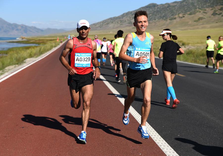 2018赛里木湖半程马拉松赛的参赛选手在比赛中(2018年8月11日摄)。新华社记者 阿曼 摄