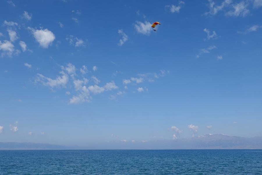 在赛里木湖景区,游客体验电动滑翔伞(2025年7月16日摄)。新华社记者 耿馨宁 摄