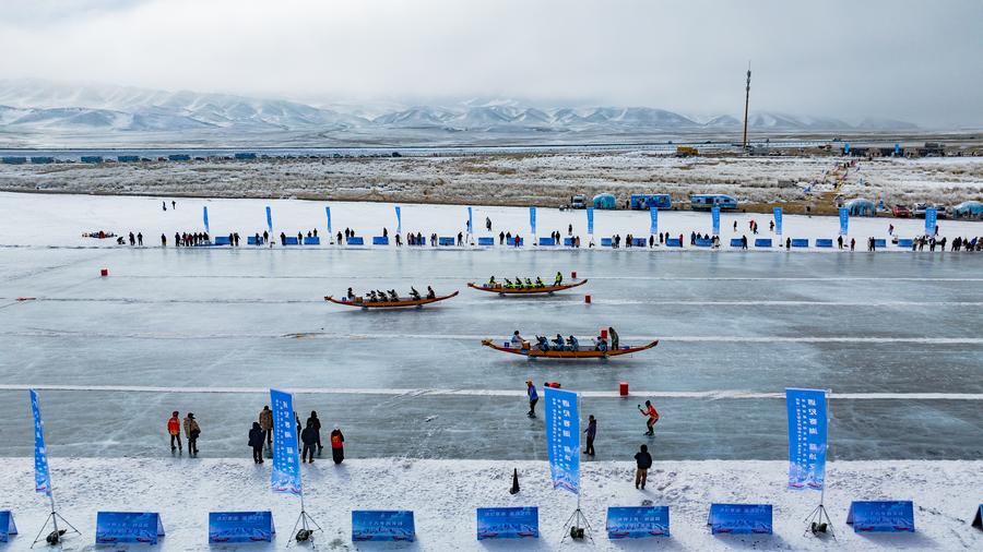 在冰面上竞渡龙舟
