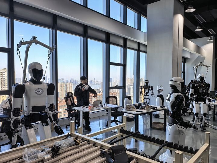 与武汉阿里中心一街之隔,在武汉数创大厦的29层,一列人形机器人正在工程师的指挥下,模仿着人类的动作,学习端茶倒水、搬运重物等“岗前技能”。
