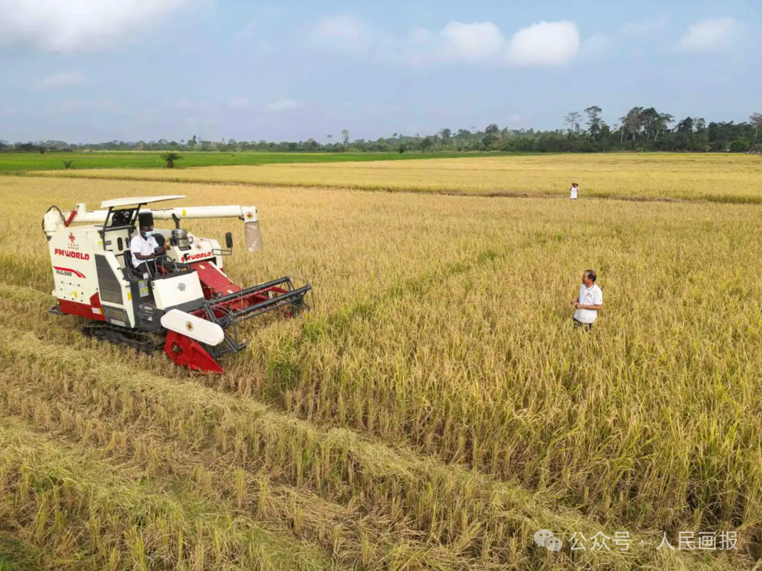 在科特迪瓦南部迪沃省格格杜垦区,中国专家指导稻农驾驶收割机收割水稻。摄影 韩旭/新华社