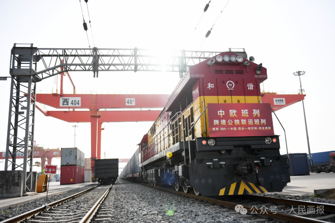 中欧班列(越南·河内——中国·西安——匈牙利·布达佩斯)跨境公铁联运班列。新华社 供图