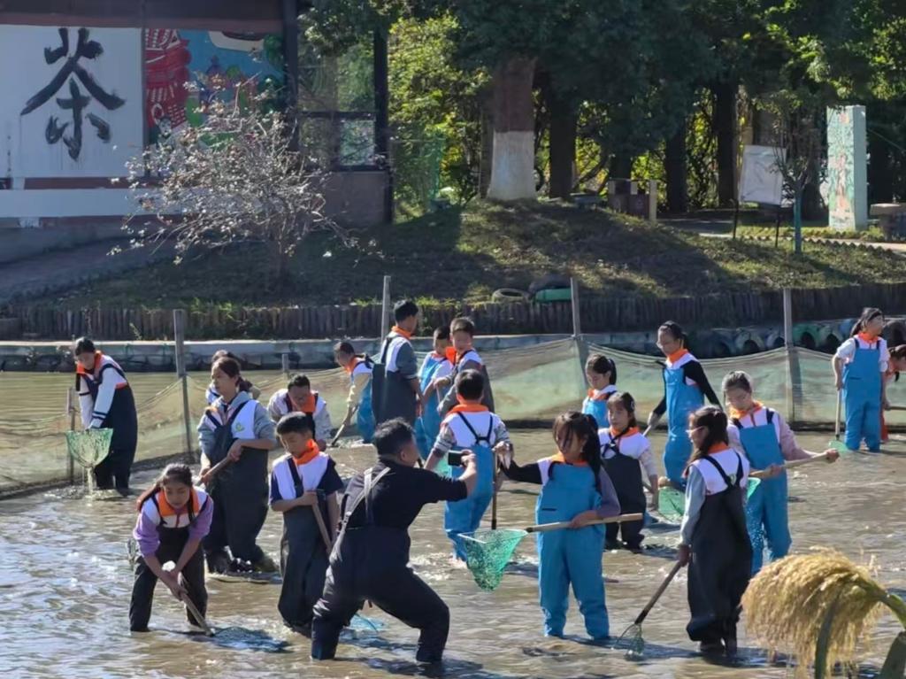 荻港渔庄内,参加研学的学生们在捕鱼。新华社记者 刘梓漪 摄