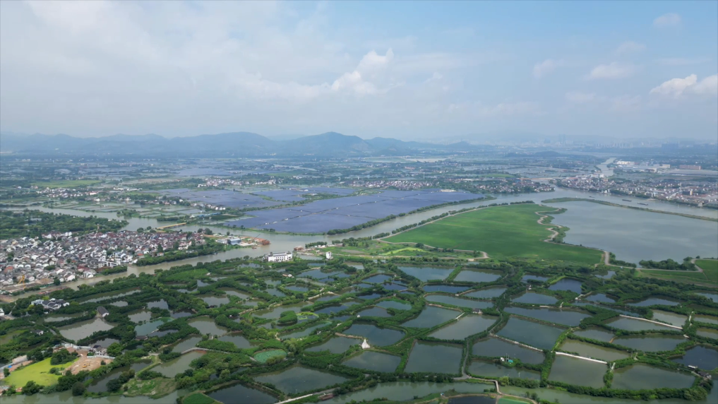天光云影倒映在水面,千余亩桑基鱼塘如镜面般镶嵌在大地上,“塘基种桑、桑叶养蚕、蚕沙喂鱼、鱼粪肥塘”,延续了超2500年的桑基鱼塘生态智慧是荻港村的核心魅力。