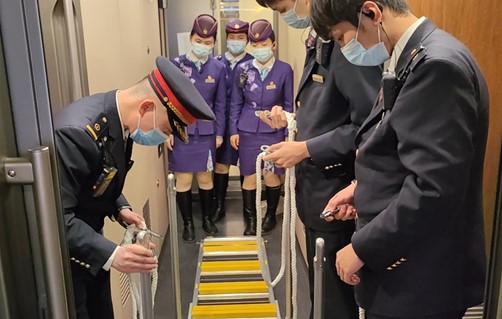 为了让旅客们的回家之路更加平安、顺畅,列车长潘波结合突发情况应急预案,多次组织人员开展模拟演练,提高应急能力。同时,开展全员安全应急教育,指导相关人员练习操作,对值乘过程进行监控,保障乘务过程中的作业安全和人身安全。
