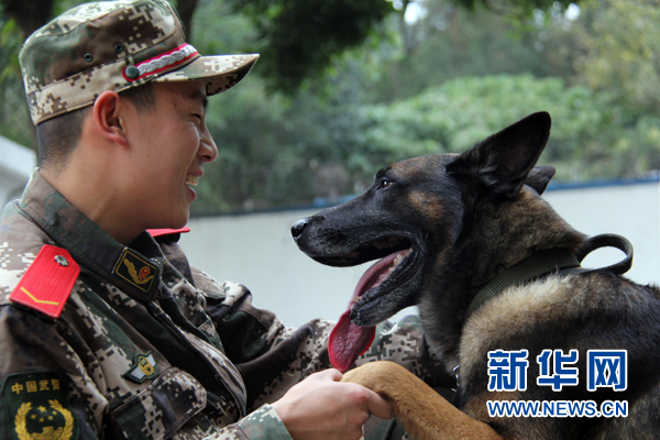 一名训导员正在与警犬互动