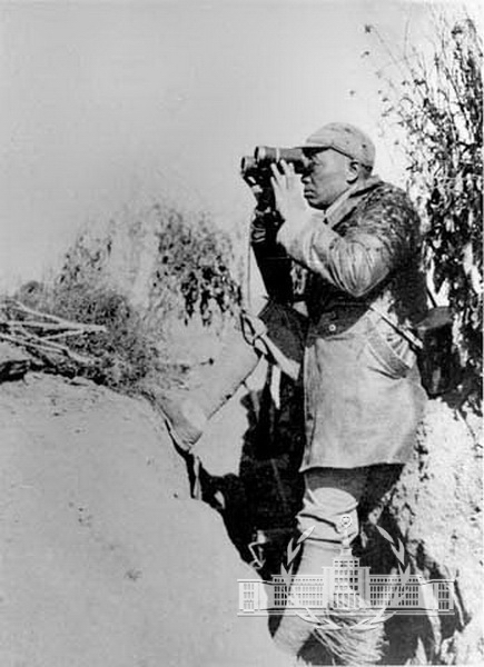 拍摄于百团大战中关家垴战斗俞沿阵地。当时,日军子弹呼啸着从彭德怀头顶飞过。他却镇定如常,泰然观察敌情,指挥作战。画面上主人公背依壕壁,手持望远镜凝神瞭望的泰然自若的神态,展现出八路军高级指挥员大智大勇、不怕牺牲的高大形象。这是一幅反映八路军高级将领战地生活的最优秀的摄影名作,也是作者最主要代表作之一。