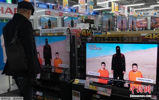 当地时间1月20日,日本东京,民众在电视机前观看极端组织劫持绑架日本人质事件播报。