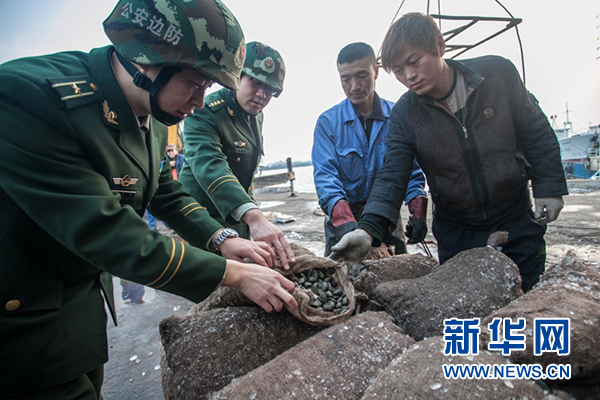 官兵帮助船员装载花蛤