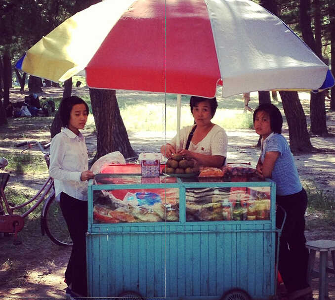 科克雷尔在元山(Wonsan)海滩附近抓拍到这些正出售各种零食小吃的女子,元山是朝鲜江原道海港城市。
