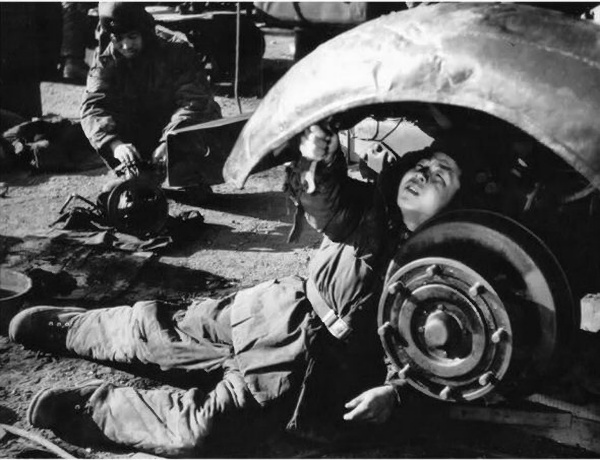 雷锋所保养的吉斯150(老解放)的前轮挡泥板下。