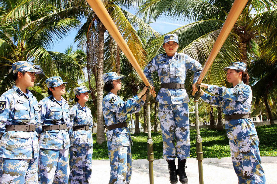 3月8日,在西沙永兴岛,女兵在练习双杠动作。