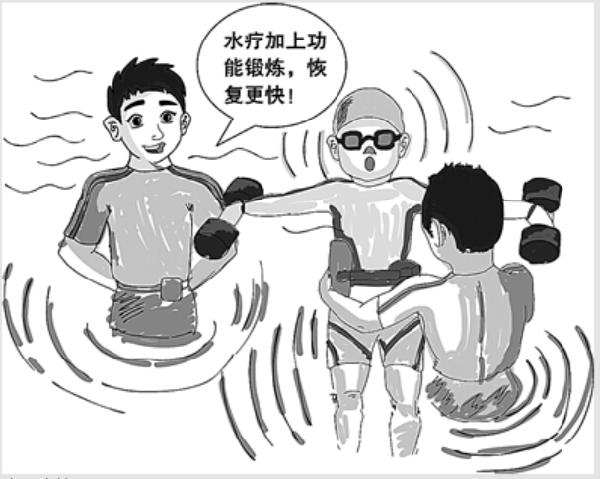 对于神经肌肉受伤的患者,重要常规康复手段是功能锻炼。但是,单纯的功能锻炼,效果并不明显。通过水疗和功能锻炼相结合,就会达到运动功能的良好康复。这说明,患者仍有残存的神经效应和肌力,在水中因为获得了水浮力的支持,使残存的肌力出现了可以看得见或感觉得到的移动效果。而在陆地上,由医护人员对患者实施被动运动或助力运动时,患者对辅助力有很大的依赖性,患者也不可能直接明显地感到自己肌力的残存,因此无法达到水疗时的效果。通过水疗,首先在医患双方的心理上建立了一种信念,使双方认识到,可以通过进一步的功能锻炼来尽可能地恢复肢体运动功能。
