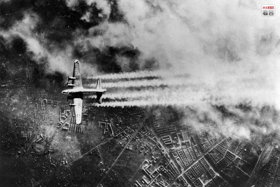 1945年2月3日,美军出动了近1000架B-17轰炸机对纳粹德国的首都进行了轰炸,这是美空军历史上最大的空袭。投弹手从24,000到27,000英尺高度上进行精确投弹,命中率非常高,柏林的铁路,军工企业,元帅府,空军部、外交部、宣传部和纳粹秘密警察(盖世太保)司令部等顿时成为一片废墟。这次大轰炸彻底摧毁了纳粹德国顽抗的意志,加速了二次大战的结束。图为1945年2月3日,满载炸弹美国空军b-17轰炸机飞过柏林。