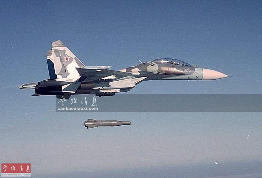 该型炸弹可穿入地下20米或穿透3米厚的钢筋混凝土层。KAB-1500L-F型配有重1.2吨的杀伤爆破战斗部。图为俄军苏-30SM战斗机投放KAB-1500重型炸弹资料图。
